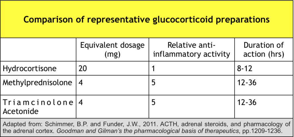 The above studies used different injectable steroids. Abdulhusein et al. (2017), Chan et al. (2008), Humphrey et al. (2010) and Resteghini and Yeoh (2012) all used hydrocortisone (25 mg) whereas Boesen et al. (2017) used Methylprednisolone (20 mg) which is a longer acting and more potent steroid (see table below). It is possible that the relatively high dosage of the steroid used, as well as the relative superior anti-inflammatory activity played a significant role in the favourable outcome of Boesen’s studies.