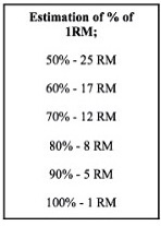 To work on strength and power it’s helpful to briefly touch on some terminology. We use the term ‘10 rep max‘ (10RM) to mean the maximal amount of weight you can lift 10 times with good technique. The 9th and 10th reps will be tough and you wouldn’t manage an 11th or 12th rep. Obviously it doesn’t have to be 10RM it can in theory be any number. Often the term 1RM is used in strength and conditioning. Obviously this means the maximal amount of weight you can lift just once with good technique. Many recommendations are then made based on this – such as a percentage of 1RM. The downside of this is that it is actually pretty hard to determine your 1RM if you have no access to gym equipment or are inexperienced in the gym. What we’ll do instead is approximate, below is a table approximating percentage of 1RM (I forget the initial source so I don’t have a reference I’m afraid);