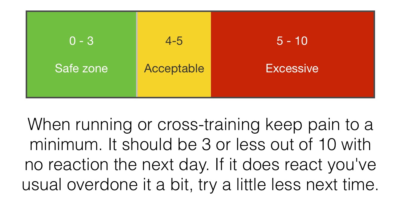 During injury, the right amount of exercise can stimulate healing and recovery. Where possible try to keep up some running but adapt your training to a comfortable level. This may mean replacing some runs with cross-training or modifying training volume, intensity or frequency but this is preferable to stopping entirely. Essentially change how much you train, how hard and how often! Obviously some injuries do require a rest period (such as stress fractures, very irritable tendon pain and acute cases of MTSS) but many can be managed by modifying training instead of stopping. A pain scale can give useful guidance;