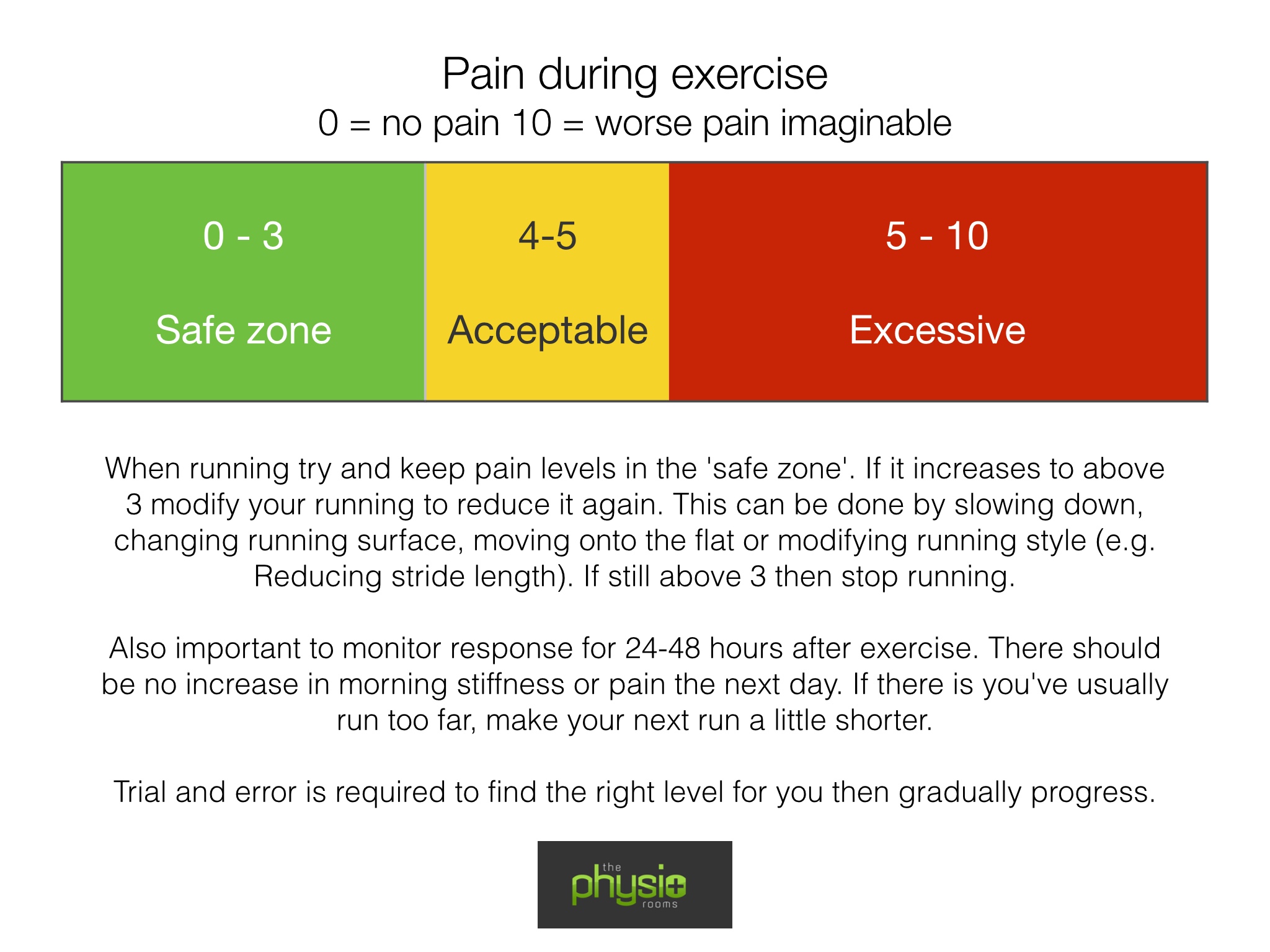- Develop some strategies to reduce pain when running (e.g. Changing stride length, slowing down etc.) practice these in training to see what works.