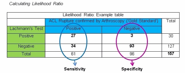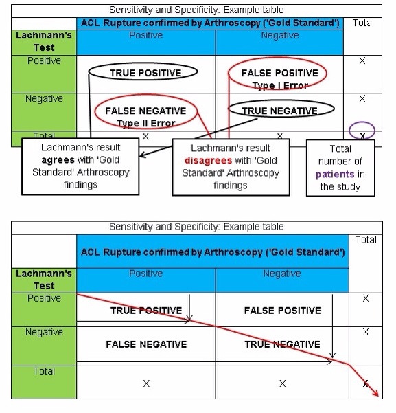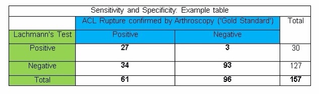 The table below shows a FICTIONAL example. The data in the table IS NOT ACTUALLY RELATED TO THE LACHMANN’S TEST OR ACL INJURIES!!! From this point on the figures used in subsequent examples will relate to this table.