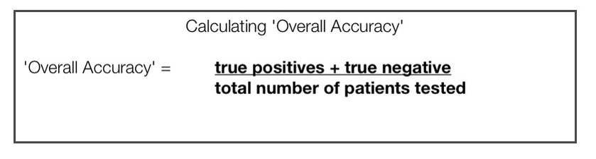 This simply related to the NUMBER OF CORRECT RESULTS the measure produces when compared to the ‘Gold Standard‘. It should be noted however that this is rarely used in practice as it is highly susceptible to change in the prevalence of pathology and sampling characteristics.