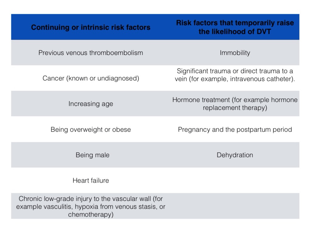 An assessment tool called the Well’s Score can be used to determine the likelihood of a DVT and guide further investigation and management. This is a combination of signs, symptoms and risk factors;
