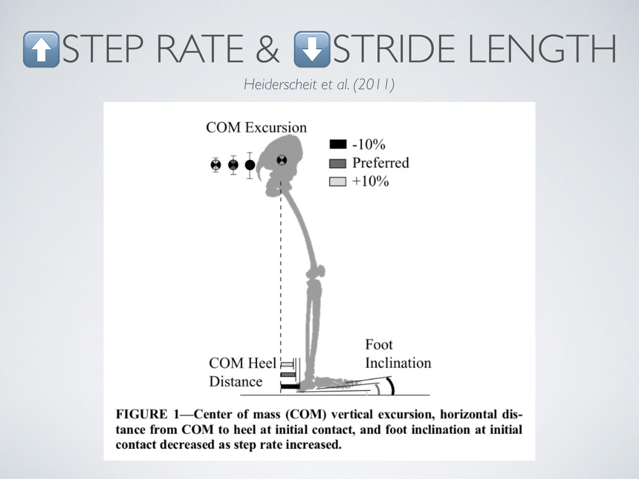 Multiple studies now show this method can reduce load on the knee and hip and reduce shock absorption at impact (Schubert et al. 2014, Lenhart et al. 2014, Wilson et al. 2014) . Heiderscheit et al. (2011) also demonstrated an increase in step rate (another term for stride frequency) reduces foot inclination at initial contact, reducing footstrike angle – essentially moving along the continuum towards a more midfoot strike;