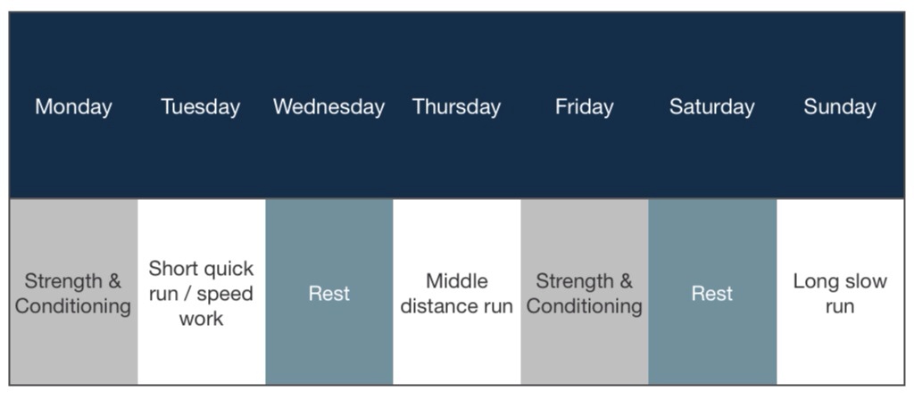 The aim of this approach is to reduce the risk of injury and improve performance by building a baseline, avoiding large increases in mileage and working on strength and conditioning. Rest days are utilised prior to long runs and to prevent multiple consecutive days of training.