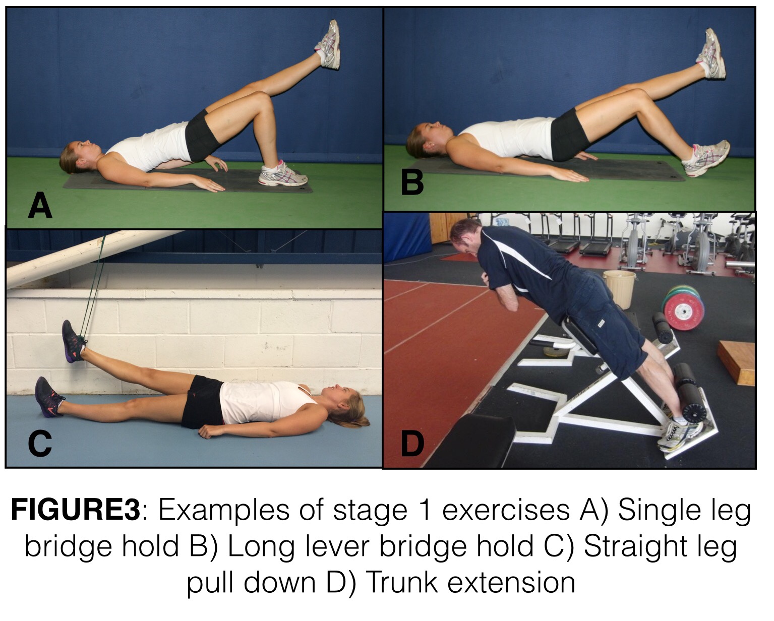 Stage 1 – Isometrics (usually in minimal hip flexion)