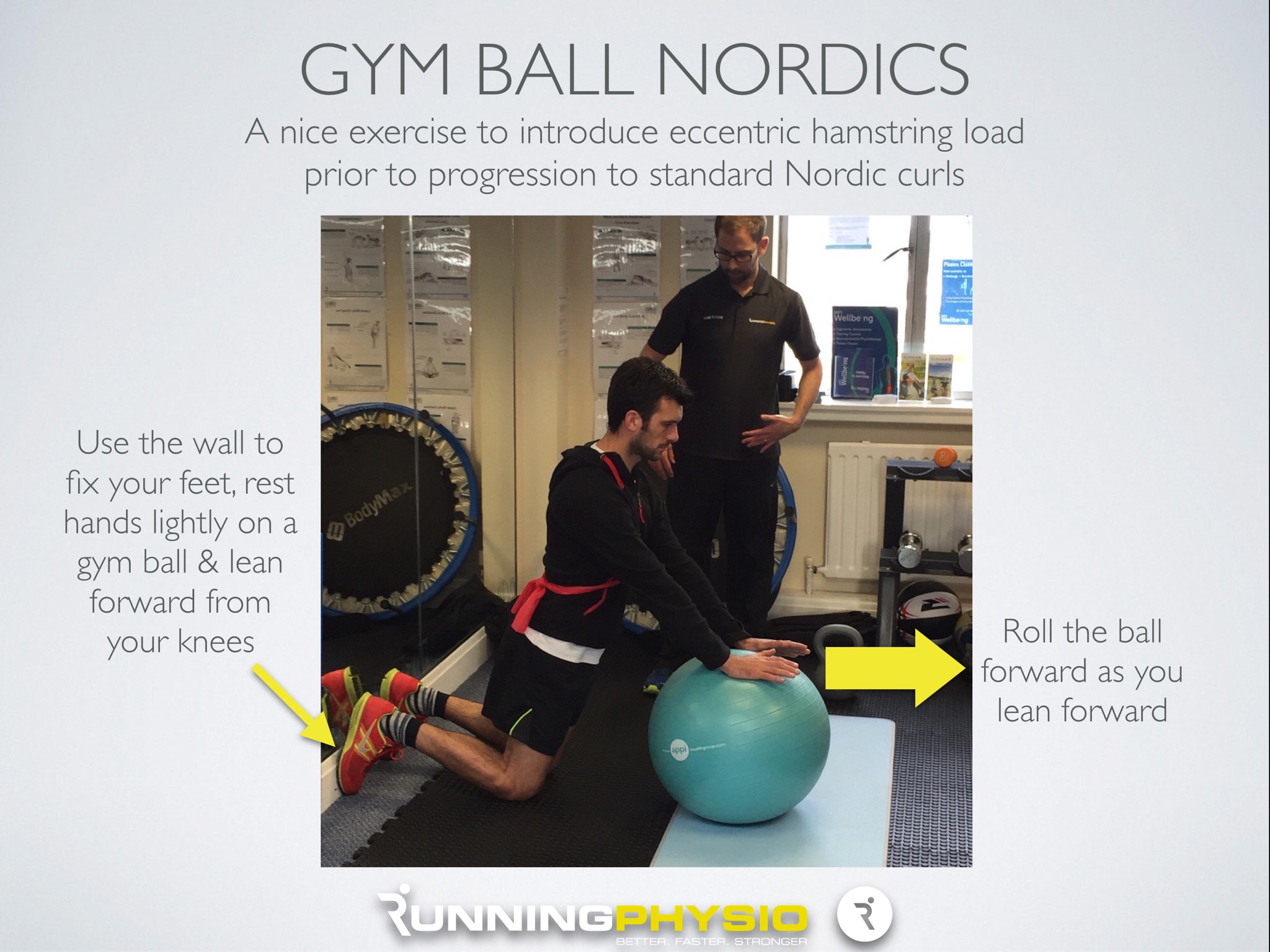 Often need to build strength first prior to starting Nordics. A gym ball Nordic can be a good way to introduce a patient to this;