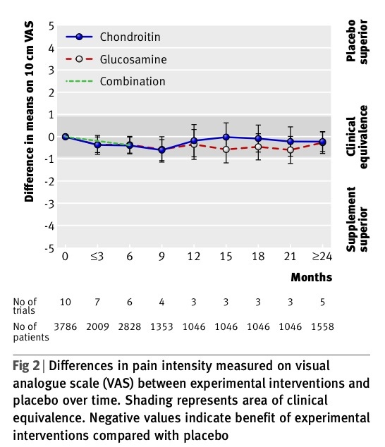 They found that the overall difference in pain intensity compared with placebo (on the 10cm VAS) was -0.4 for Glucosamine, -0.3 for Chondroitin and -0.5 for the combination of both. All except 3 trials were funded by the manufacturers of the supplements. For those that were independent, the treatment effect was ‘minute to zero and by no means clinically relevant.’ The changes in minimal joint space width were also all described as minute leading them to conclude,