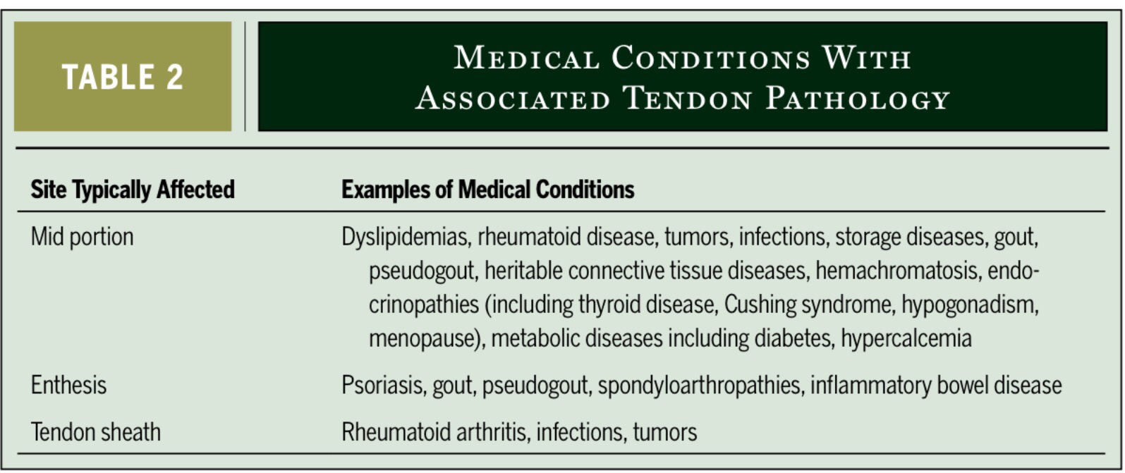 - Thyroid dysfunction – thyroid hormones can influence tendon homeostasis and collagen synthesis but their exact role in tendinopathy is not yet fully understood. Olivia et al. (2013) discuss this complex topic in a little more detail (thanks @AngeloCacchio for recommending this paper!).