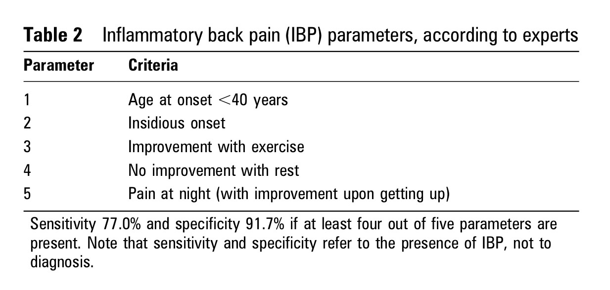 Sieper et al. (2009) suggested 5 parameters for identifying the presence of inflammatory back pain according to experts in the field;