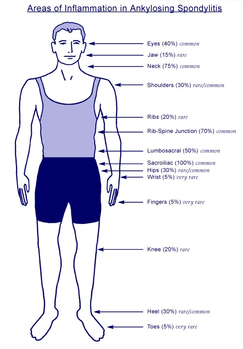 Ankylosing Spondylitis (AS) typically presents with axial symptoms as discussed above but can include multiple symptomatic areas;