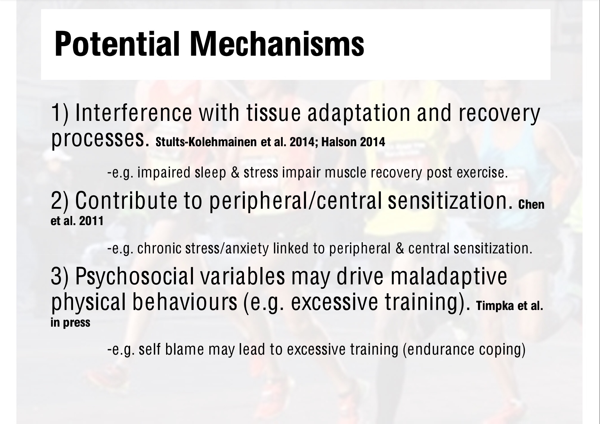 Anxiety and depression have also been found to influence pain and coping strategies (Gerrits et al. 2015) and could also be an important factor in tendon pain. Lack of sleep may influence pain (Finan et al. 2013) and has been linked with increased injury risk (in adolescent athletes – Milewski et al. 2014) and impaired performance in athletes (Marshall and Turner 2016).