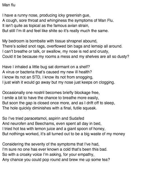Week 4 is a step down in terms of mileage – my schedule says 28 miles – but I might do far less. Monday I awoke with a sniffle with developed through the day into Man Flu…