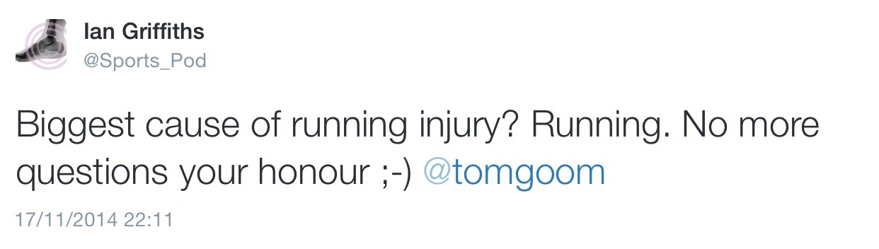 While I’m sure Ian’s tweet was a tad tongue in cheek he does touch on an important point with running injury – in order to get one you do have to actually run! This is a point that a recent research paper has expanded on,